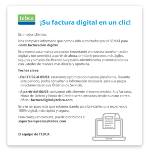 La empresa puede contactar al Centro de Soporte para realizar sus consultas o solicitudes a través del correo electrónico: soporteempresas@tebca.com, de lunes a viernes en horario de oficina. Allí podrá realizar todas las consultas relacionadas con: